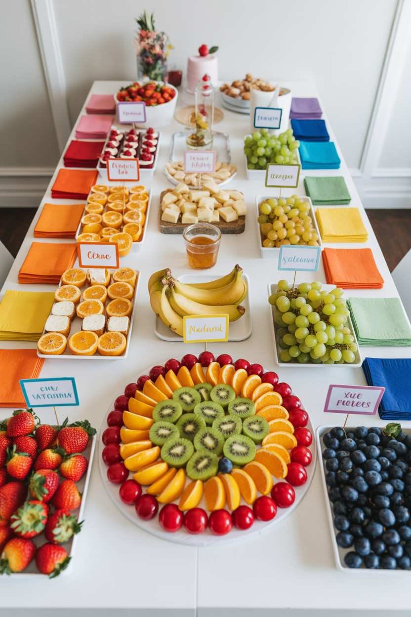 Arrange them on the table in color order and the display basically takes care of itself. Add matching napkins and small signs for each section. A fruit rainbow platter at the center of your food table is a total show-stopper and people actually eat it, which is a bonus. 🙂