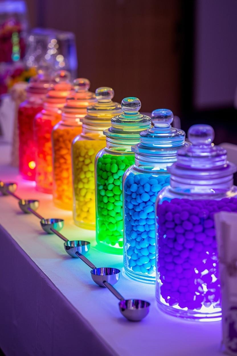 A candy bar sorted by color is one of those ideas that is almost too simple but absolutely delivers. Line up clear jars or glass bowls and fill each one with a single color of candy.
