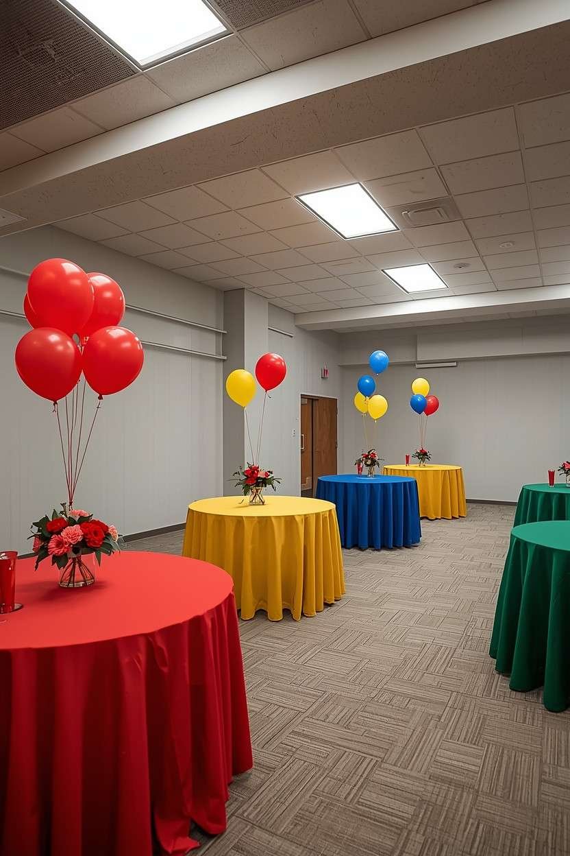You can do this on any budget. Dollar store tablecloths and a few matching balloons per table is all it takes. No elaborate centerpieces needed.