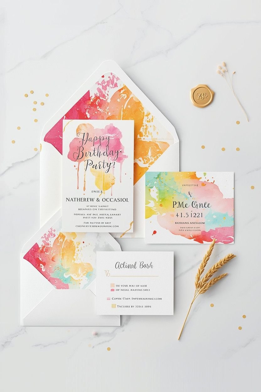 Okay this one starts before the party even happens. A watercolor-style invitation sets the tone from the first moment. Bright splashes of color, handwritten fonts, maybe a little gold foil and it tells people this is going to be a visually fun event before guests even show up.